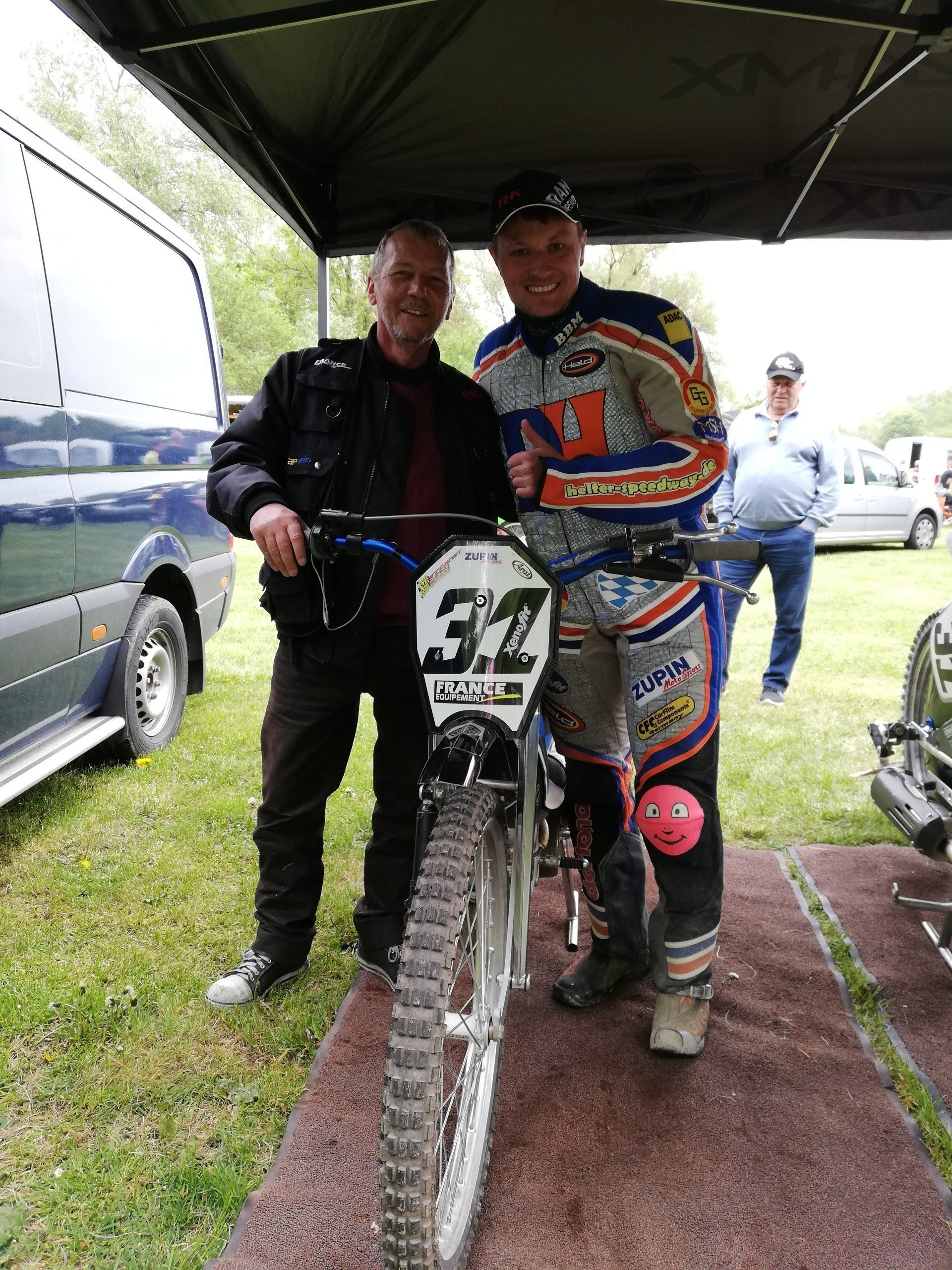 Alles fertig eingeladen, auch der Motor wurde noch rechtzeitig fertig, ging es dann am Mittwoch, 29.05.19 nach einem gemütlichen Frühstück nach Herxheim. Dort angekommen bezogen wir erstmal unsere Zimmer in der Pension in der wir jedes Jahr wieder sind, anschließend ging es dann zur Bahn. Dort trafen wir bei perfekten Wetter auf eine bestens präparierte Bahn und Dennis freute sich schon auf das Training. Dennis ging mit seinem zweiten Langbahnmotor ins Training fand sofort eine gute und schnelle Linie, denn wie er selber sagt ist Herxheim eine seiner Lieblingsbahnen. Als er jedoch aus dem Training kam vernahm jeder von uns ein unangenehmes klappern, welches vom Motor zu kommen scheint. Dennis entschied sofort das der Motor raus muss und schnellstmöglich der andere Motor mit den frisch eingeschliffenen Ventilen rein. Nun musste es schnell gehen. Dennis wollte das zweite Training schon mit dem Motor fahren, um zu schauen ob er wieder die volle Leistung hatte. Schnell bauten wir den Motor aus und den Motor, den wir erst am Dienstag abend wieder zusammengebaut haben ein. Dennis konnte das 2. Training fahren und das auch noch ganz alleine denn scheinbar wollte keiner mehr mit raus fahren. Dennis war fertig mit seinem Training wollte umdrehen und zurück ins Fahrerlager und schon blockierte alles, der nächste Schock, ist es vielleicht das Getriebe? Als wir dann aber als erstes (wie immer) die Kupplung kühlten, stellten wir das Problem sofort fest, der Zahnriemen ist total streng und das zweite Übel und der eigentliche Auslöser für das Problem, der Segerring wurde vom Pulli herunter geschoben und verkeilte sich zwischen Riemen und Kupplungskorb. Wieder begann ein großer Workshop und Dennis verlor langsam die Zuversicht auf ein gutes Ergebnis und auch seine gute Laune wich nun gänzlich. Allerdings war er mit der Motorleistung wieder zufrieden. Wir entschieden uns sicherhaltshalber den ganz neuen Pulli vom Ersatzmotorrad sowie einen neuen Riemen auf das Einsatzmotorrad zu bauen, da dieser noch nicht so eingearbeitet war. Nach einer langen Pause, in der die GP-Fahrer Training fuhren, galt es nun das Pflichttraining zu absolvieren und anschließend den 1. Lauf. Nun lief es endlich wieder für Dennis. Er konnte sein Pflichttraining gewinnen und im 1. Lauf wurde er hinter dem starken Franzosen Steven Goret zweiter. Somit war der erste Tag beendet. Am Donnerstag ging es dann gleich in der früh weiter mit Lauf drei und vier, die Dennis beide für sich entscheiden konnte. Auch Goret konnte seine zwei Läufe für sich entscheiden und somit sah es vor dem Finale, welches am Nachmittag zwischen dem GP gefahren wurde, folgendermaßen aus: An der Spitze Goret mit 15 Punkten gefolgt von Dennis 14, Drofa 12, Comblon 11, Timo Wachs 8 und Trapp 6. Also hieß es volle Attacke nach vorne. Nachdem der erste Start wegen eines Sturzes in der ersten Kurve abgebrochen wurde, bei dem Dennis hinter Drofa auf P2 war, gab es einen Neustart. An dieser Stelle ein Dank an das gesamte Team um Pepe France, welches uns auf der Bahn unterstützt hatte um alles für den Restart fertig zu machen. Dennis kam von Startplatz blau wieder gut weg, aber auch Drofa von rot und Goret von weiß kamen sehr gut weg und es gab über vier Runden einen Dreikampf. Dennis war ausgangs der ersten Kurve hinter Drofa auf P2. In der Spitzkehre konnte Dennis ein paar Meter auf Drofa gut machen aber Goret kam ganz außen und ging an uns beiden vorbei. Zum Ende der zweiten Runde konnte Dennis dann in der Spitzkehre an Drofa vorbei gehen und nahm die Verfolgung auf Goret auf. Dennis konnte sich noch etwas hinfahren was aber für einen Angriff nicht reichte und somit wurde er hinter Goret zweiter was auch in der Endabrechnung P2 bedeutete. „Ich bin mit dem Ergebnis nach den ganzen Problemen am Mittwoch voll zufrieden. Auch in der Wertung zur Süddeutschen Bahnmeisterschaft konnte ich die Maximale Punktezahl von 5 schreiben, da Goret als Franzose und somit als „Ausländer“ rausgewertet wird“, so Dennis nach dem Rennen.