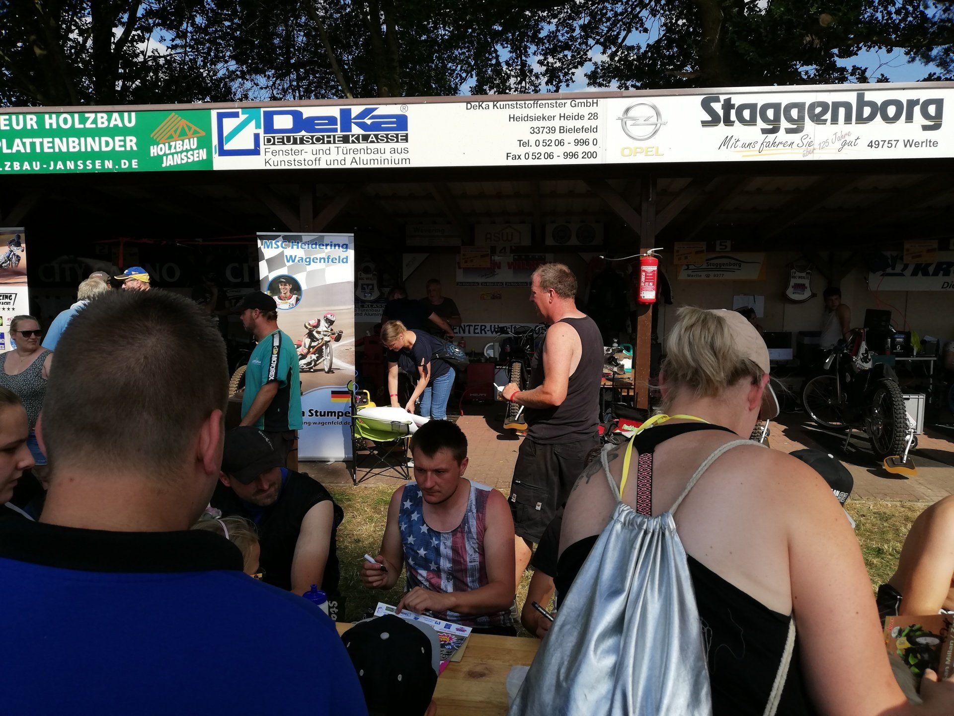 Nach einem gemütlichen Frühstück ging es um ca. 9:00 Uhr bei warmen und sonnigen Wetter ins Stadion um dort alles vorzubereiten. Es folgte um 10:00 Uhr die technische Abnahme bis dann um 13:00 Uhr das Training begann. Im ersten freien Training kam Dennis eigentlich schon gut zurecht, man bedenke das Werlte nicht gerade seine Lieblingbahn ist. Als das Training nach 3 Runden zu ende war und es zurück ins Fahrerlager ging, stellte Dennis fest das es schon wieder mal ein klackerndes Geräusch vom Motor gab. Es blieb nicht viel Zeit um den Fehler bis zum zweiten freien Training ausfindig zu machen und so mussten wir auf das Ersatzbike wechseln. Das zweite freie Training lief dann soweit auch ganz gut. Nun gab es nur einen kleinen Bahndienst und schon ging es zum Startbandtraing, 2x2 Runden. Im ersten Run hatte Dennis keinen guten Start und wurde nur fünfter. Im zweiten Run gewann er dann den Start, konnte zwei gute Runden hinlegen und gewann diesen dann auch. „Hier in Werlte ist der Start sehr wichtig, da die Bahn einen dunklen, sehr feinen und tiefen Sand hat ist es sehr schwer im Strahl bzw. Staub zu fahren“, so Dennis nach dem Training. Um 14:00 Uhr war dann das Training für uns vorbei, nun hieß es warten bis zum Rennbeginn um 18.30 Uhr. In dieser Pause nutzten wir die Zeit um den klackernden Motor auszubauen, eine kurze Fehlerdiagnose zu machen und einen anderen einzubauen. Wir entschieden uns aber mit dem Ersatzbike im Rennen zu fahren. Um 17:00 Uhr gab es dann für die Fans eine große und sehr gut besuchte Autogrammstunde mit allen Fahrern im Fahrerlager, bis es dann um 18:00 Uhr zur Fahrervorstellung ging. Pünktlich um 18:30Uhr ging es dann los. Dennis musste in Rennen Nr. 2 auf die Bahn. Er hatte vom Startplatz blau einen mäßigen Start, verlor in der ersten Kurve noch eine Position, konnte auch nicht mehr zurückschlagen und so fand er sich auf P5 wieder, was 0 Punkte bedeutete. Dennis war nach diesem Lauf sehr enttäuscht und es hieß jetzt in den verbleibenden drei Läufen richtig zu punkten um noch ins Finale zu kommen. Im zweiten Lauf gab es nach einem Sturz in der ersten Kurve von Marcel Sebastian einen Abbruch. Im Rerun konnte Dennis einen 3. Platz und 2 Punkte hinter Julian Bielmeier und dem späteren Sieger Fabian Wachs einfahren. Lauf drei brachte wieder nur 2 Punkte hinter einem überraschend starken Timo Wachs und Jens Buchberger. Jetzt war der Zug fürs Finale leider schon abgefahren. Im vierten Lauf gab es gleich zwei Abbrüche. Abbruch eins nach einem Frühstart von Buchberger und Abbruch zwei nach einen Cowboystart von Mario Niedermeier. Im dritten Anlauf konnte Dennis hinter Sascha Stumpe und vor Dirk Oellrich einen 2. Platz und 3 Punkte einfahren was am Ende 7 Punkte bedeutete. Für den Einzug ins Finale hätte Dennis aber 9 Punkte gebraucht und so musste er sich mit den 6. Platz zufrieden geben. „Es war heute kein einfacher Tag für mich, ich hatte nur mittelmäßige Starts und konnte auch im Rennverlauf keine Meter mehr gutmachen. Die Bahn war etwas besser als in den Jahren zuvor, aber trotzdem werde ich mit Werlte irgendwie kein Freund. Mit Platz 6 ist mein Team im großen und ganzen zufrieden, da es in den letzten Jahren ohne Motorproblemen noch 3 oder 4 Plätze schlechter war und wir eine deutliche Steigerung sahen, allerdings war mein persönliches Ziel ins Finale zu kommen was aber leider nicht klappte. Der Veranstalter hat ein super Rennen auf die Beine gestellt und es wurde den Fans super Sport geboten“, so Dennis nach dem Rennen.